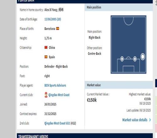 杨希现今20岁,司职边后卫,国青成员,出自西班牙青训,曾效力西班牙人B队。25赛季,他效力于青岛西海岸,出场21次,完成106次抢断,稳居中超25赛季抢断榜榜首。